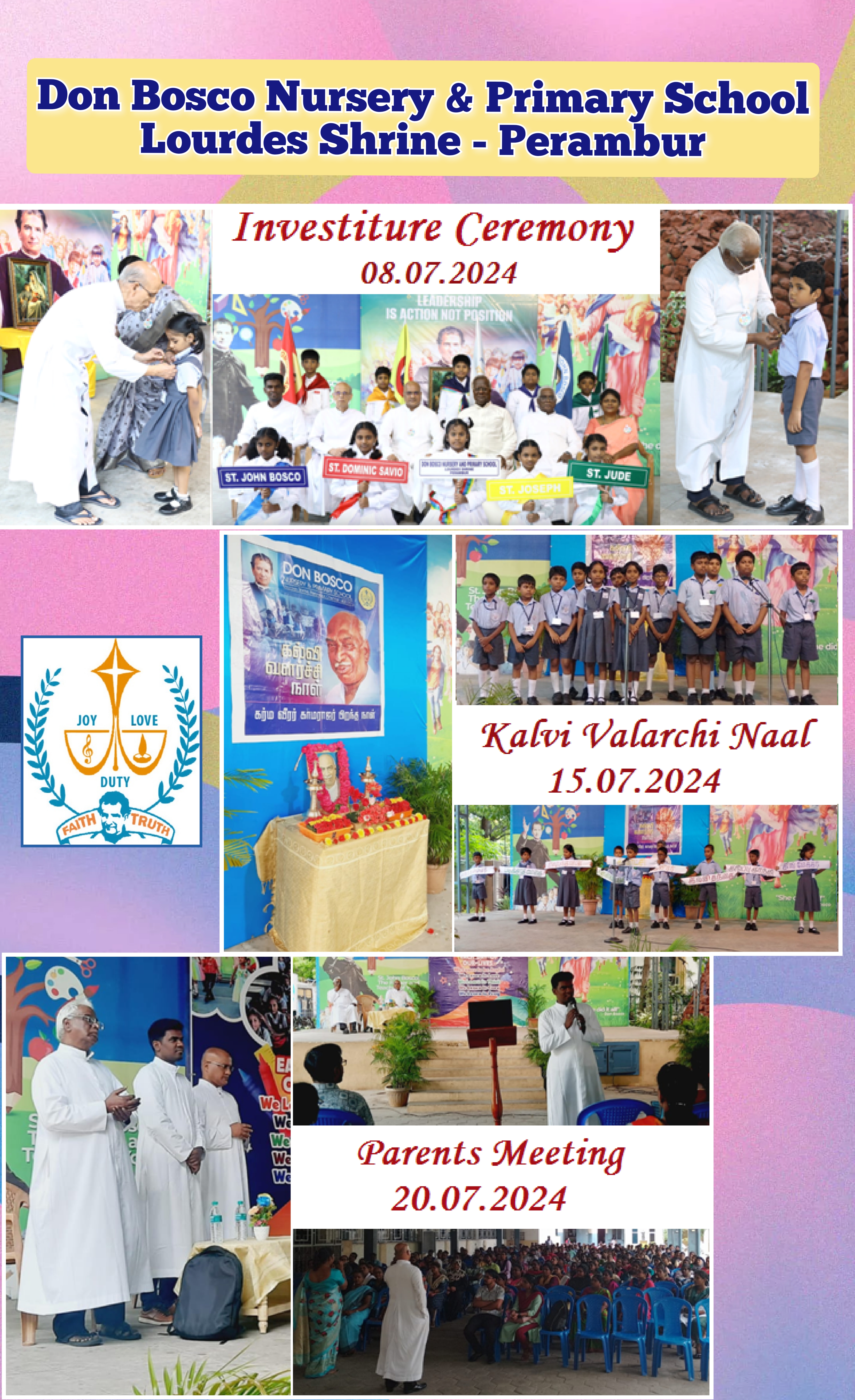 Investiture Ceremony of our school was held on 8 th July 2024 at 9.00 am.Our Rector and Correspondent Rev. Fr. Stanislaus Presided over the celebration. Our new Principal Rev. Fr. Dominic Matthews, our Administrator Rev. Fr. Vincent, Rev. Fr. Tharsius and Rev. Fr. K.J. Louis were present for the programme. They were welcomed by our DB Band followed by the Prayer song by our DB choir. Our Headmistress Mrs. Ansilam welcomed the gathering. Rev. Fr. Stanislaus hoisted the school flag and delivered his address. The students of STD-IV presented a colourful and variety entertainment which consisted of songs and dances. They welcomed our new Principal using acronym. The School Pupil leader, Asst. Pupil leader, house captains and vice captains were badged by our correspondent, Principal and Administrator. Class captains and Vice captains were badged by our Rev. Fr. Tharsius and Rev. Fr. Louis. Class house captains and Vice Captains were badged by the house teachers. Volunteers were badged by our Sports mistress Mrs. Ezhilarasi and the office staff. Our Principal Rev. Fr. Dominic Matthews and our former Principal Rev. Fr. Tharsius delivered their messages. Our Sports mistress proposed the vote of thanks. Mrs. Anita Lewcock mastered the ceremony. The Programme concluded with the National Anthem.